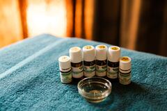 フットバスで脚をあたため血流促進しながら、その日のその時の状態で、精油のチョイス。